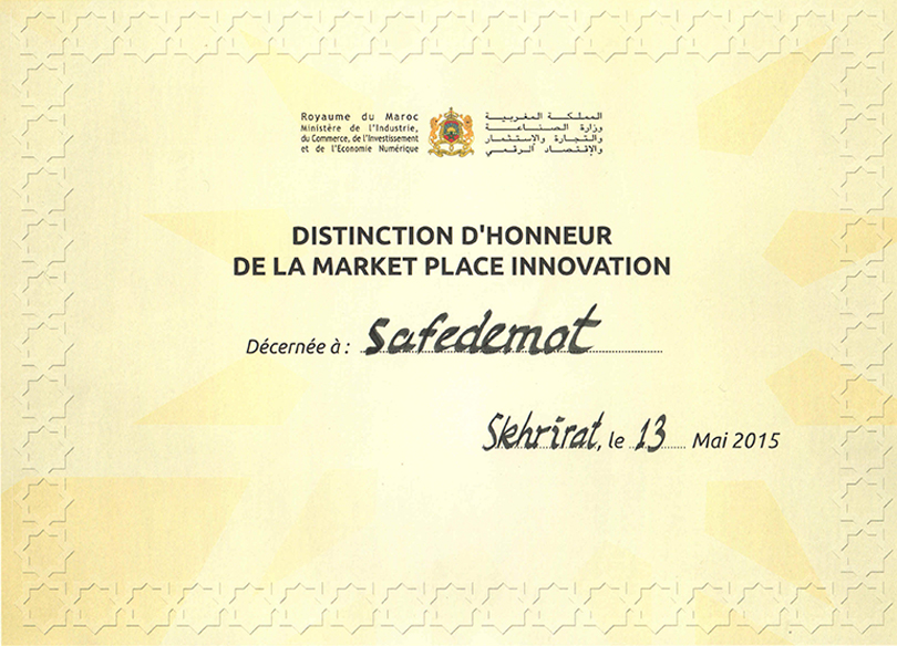 La plateforme SafeExchange de SafeDEMAT, remporte la distinction d’honneur de la Market Place Innovation de l’Innovation Prize for Africa 2015 (4ème édition du Prix de l’Innovation pour l’Afrique) organisée par le Ministère de l’Industrie, du Commerce, de l’Investissement et de l’Économie Numérique à Skhirate,sous le haut patronage de Sa Majesté le Roi Mohammed VI.